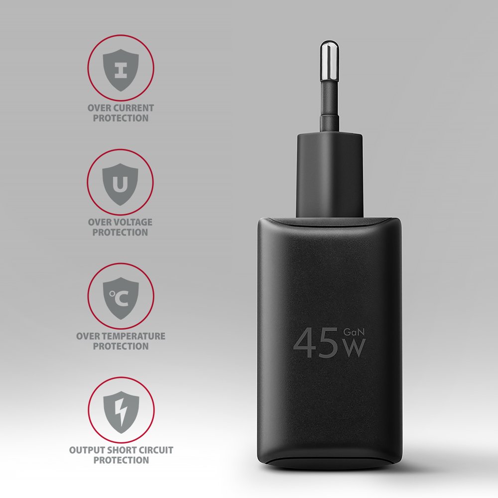 | Gamintojo prekės serija | GaN wallcharger 2x port (USB-A + USB-C), PD3.0/PPS/QC4+/SFC2.0/AFC/SCP/FCP/Apple, 45W |