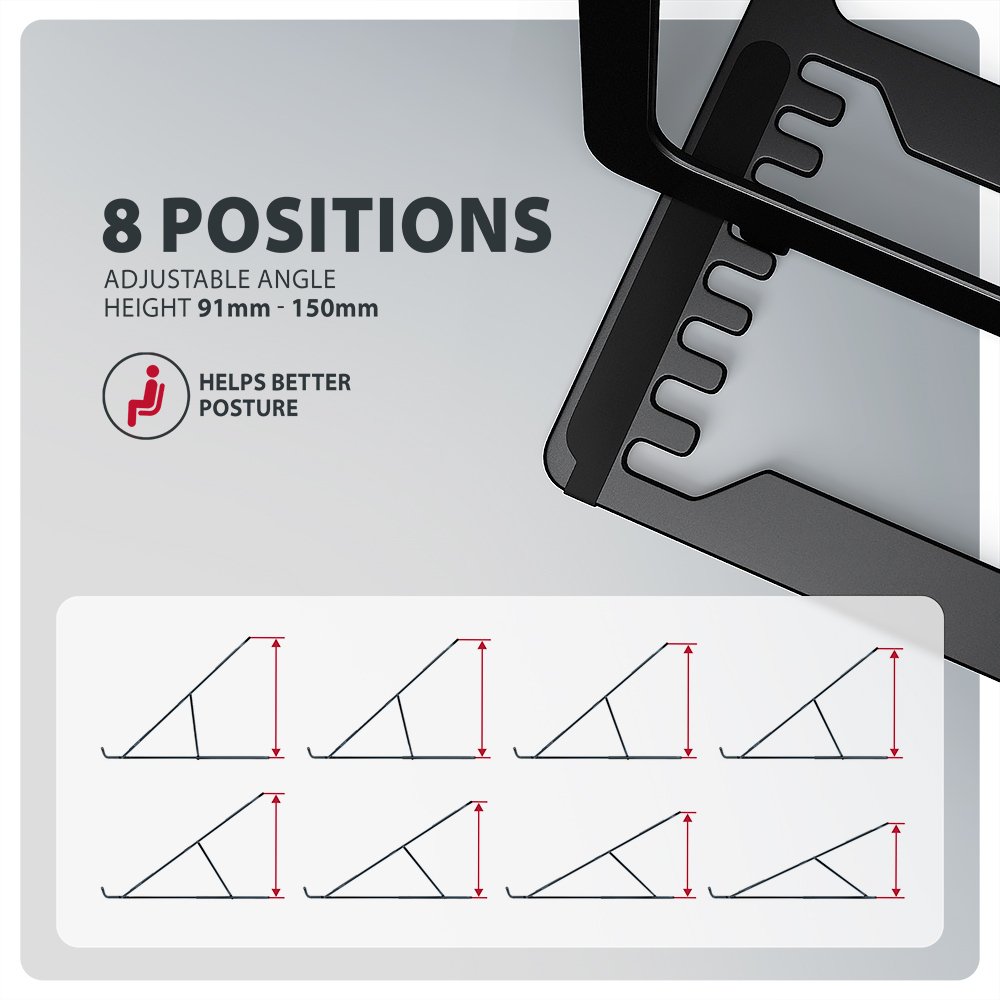 Lightweight and strong metal construction; Anti-slip finish, which also protects the device from scratches; Eight adjustable positions