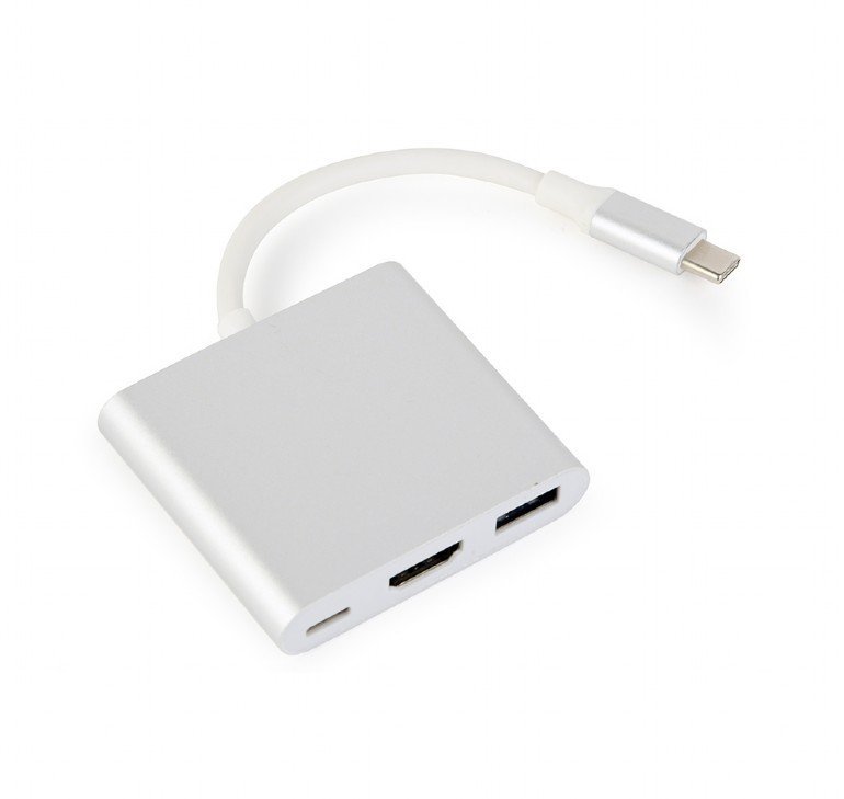 USB C-type male 3-in-1 adapter. USB C-type port for charging (no data sync). USB 3.0 data port: plug your flash-drive, camera or data sync your mobile phone. HDMI video output: connect your HDMI display (max. resolution 4K@30Hz). HDMI function is only compatible with devices that support video via USB Type-C port.