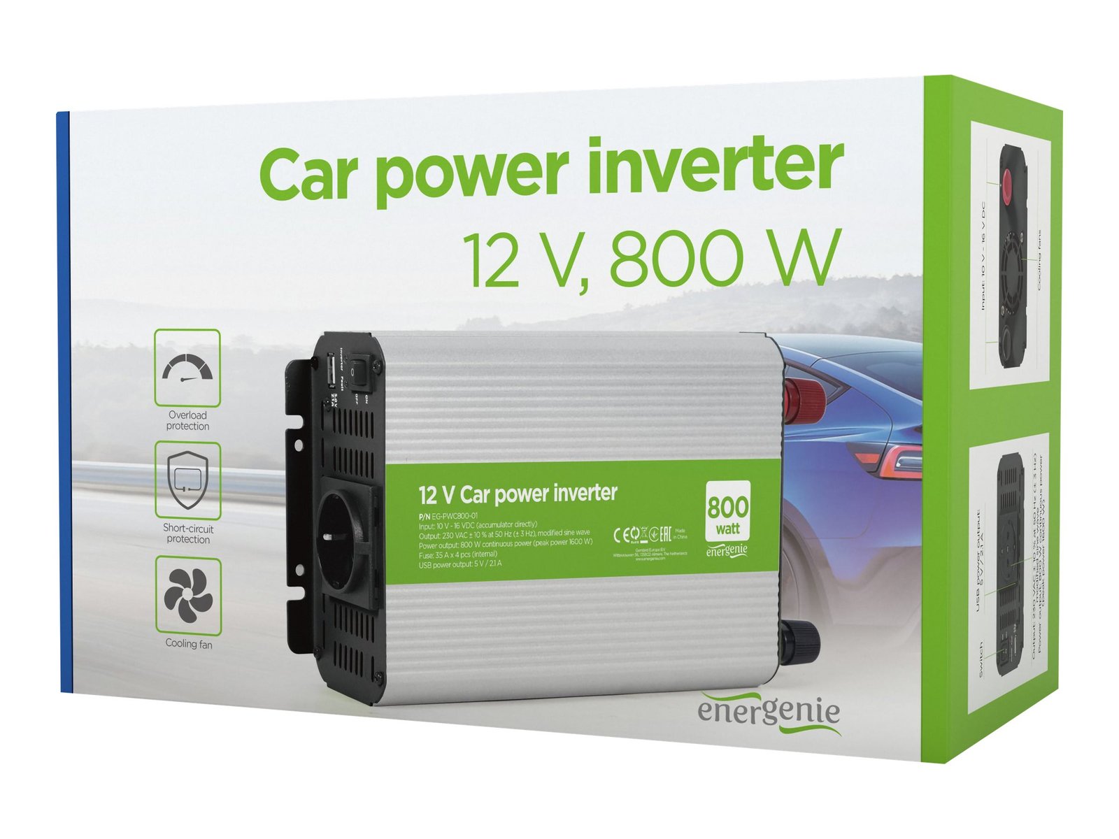| Features | 800 W car power inverter; Allows to connect any AC powered electronics (max. 800 Watt), like notebooks, HiFi or video equipment, chargers of mobile phones/cameras, electrical tools etc.; Overload- and short-circuit protection, plus a built-in cooling fan provides a stable power supply; LED status indicators and alarm buzzer |