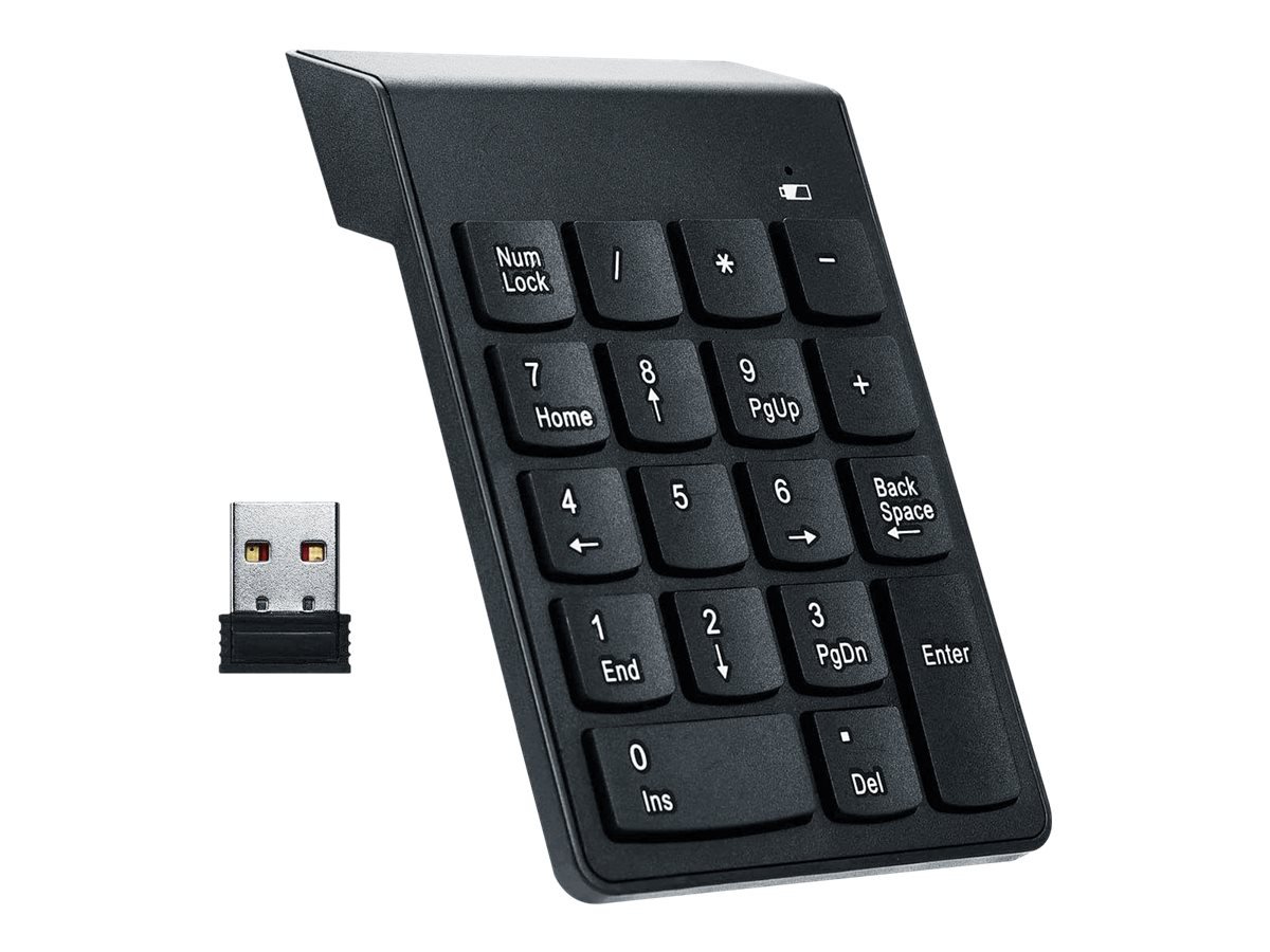 | Techniniai parametrai | Most smaller laptops are not equipped with a numpad; However, when you are working with spreadsheet, accounting or financial applications, a NumPad is indispensable; For those who are missing a NumPad on their laptop, this external version offers a practical solution; Compact wireless design; Ideal for spreadsheet, accounting or financial applications; Suitable for any PC or laptop; 18 keys |