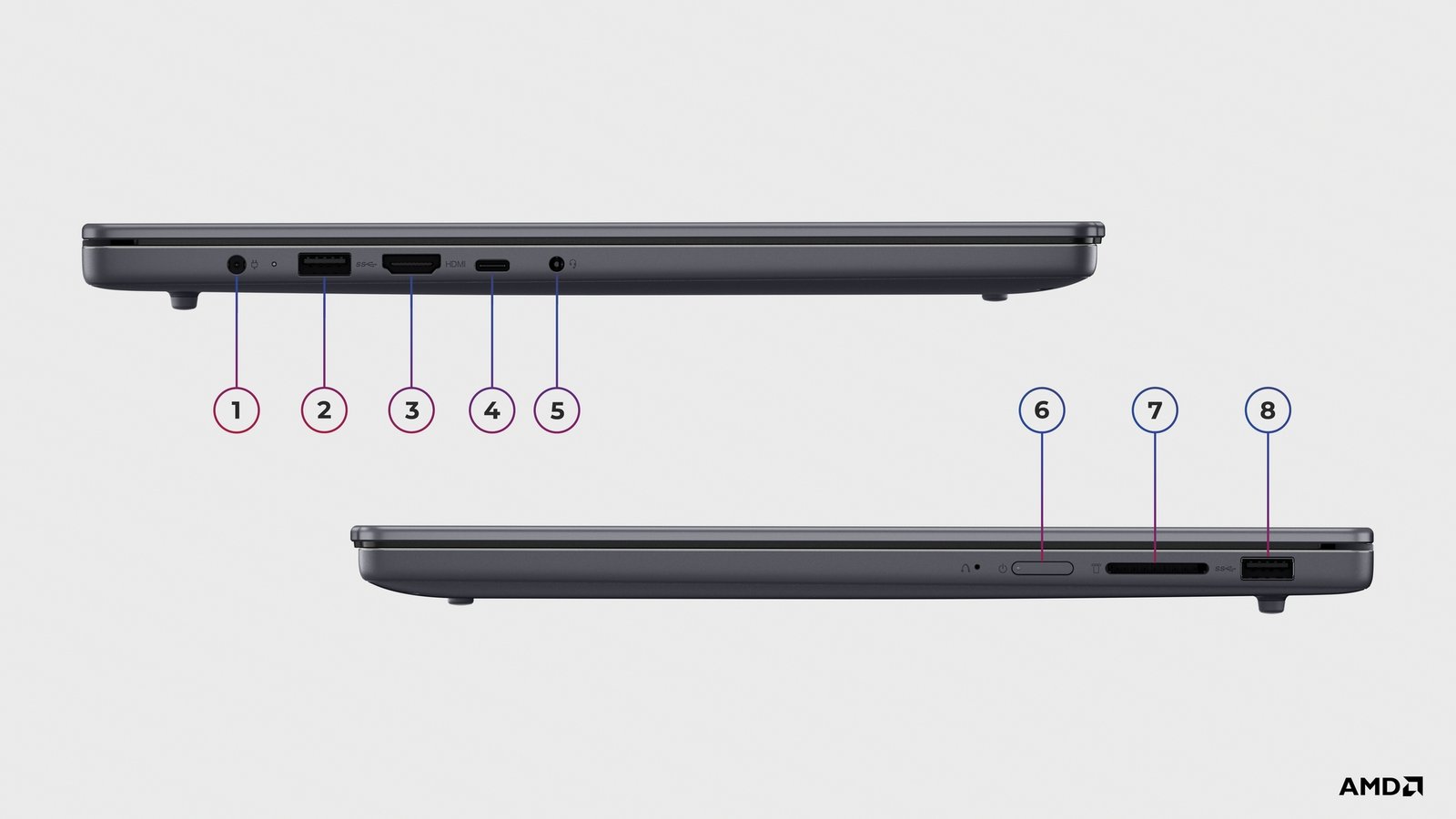 2x USB-A (USB 5Gbps/USB 3.2 Gen 1); 1x USB-C (USB 5Gbps/USB 3.2 Gen 1), with USB PD 3.0 and DisplayPort 1.2; 1x Headphone/microphone combo jack (3.5mm); 1x SD card reader; 1x Power connector