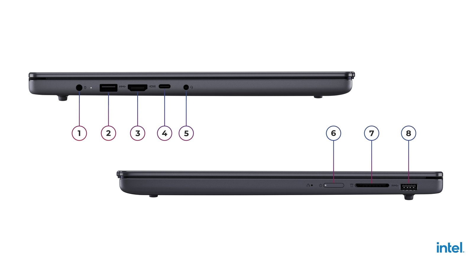 2x USB-A (USB 5Gbps/USB 3.2 Gen 1); 1x USB-C (USB 5Gbps/USB 3.2 Gen 1), with USB PD 3.0 and DisplayPort 1.2; 1x Headphone/microphone combo jack (3.5mm); 1x SD card reader; 1x Power connector