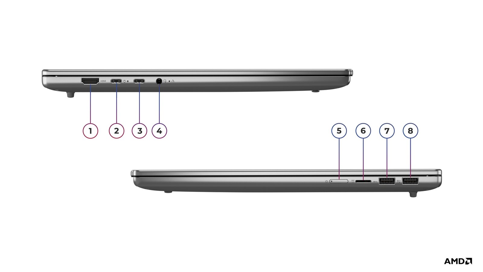 1x USB-A (USB 5Gbps/USB 3.2 Gen 1); 1x USB-A (USB 5Gbps/USB 3.2 Gen 1), Always On; 2x USB-C (USB 10Gbps/USB 3.2 Gen 2), with USB PD 3.0 and DisplayPort 1.4; 1x Headphone/microphone combo jack (3.5mm); 1x microSD card reader