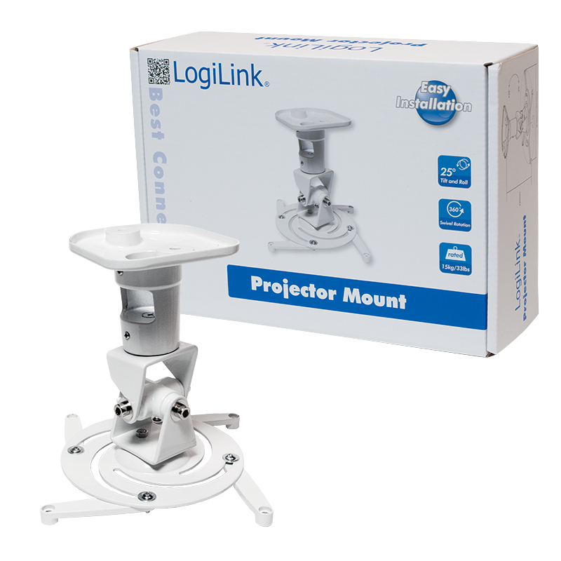 Suitable for projectors up to 15 kg Sturdy and simple design Die-cast aluminum construction Suitable for flat ceilings 25° inclinable and swiveled up to 360° For projectors with a range from 18-31 cm in diameter Adjustable metal arms Mounting hardware included Cable-mounting channel Color: White. The LogiLink projector mount is made of an aluminum alloy die-cast construction and holds projectors of up to 15 kg via a screw connection with a range from 18-31 cm in diameter. The cable-mounting channel ensures order. The mount can be tilt up to 25° and can be swiveled up to 360°. It is suitable for flat ceilings and is supplied with the necessary installation material for an easy installation.