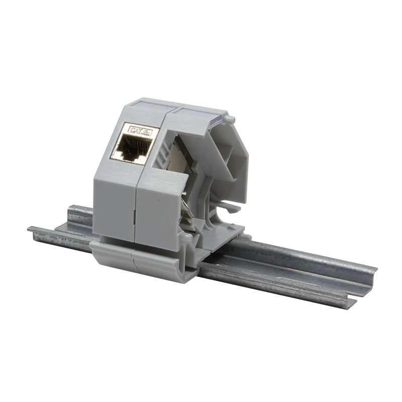 DIN rail adapter / mounting module, expandable; For RJ45 keystone jack modules Cat.5e, Cat.6 and Cat.6A; Compatible with standard 35 mm DIN rails; With grounding spring, cover and label window; Material and color: plastic, light gray