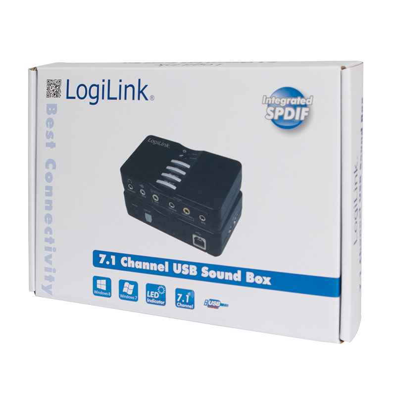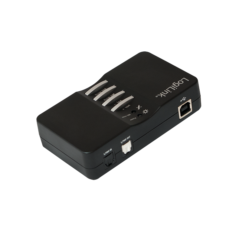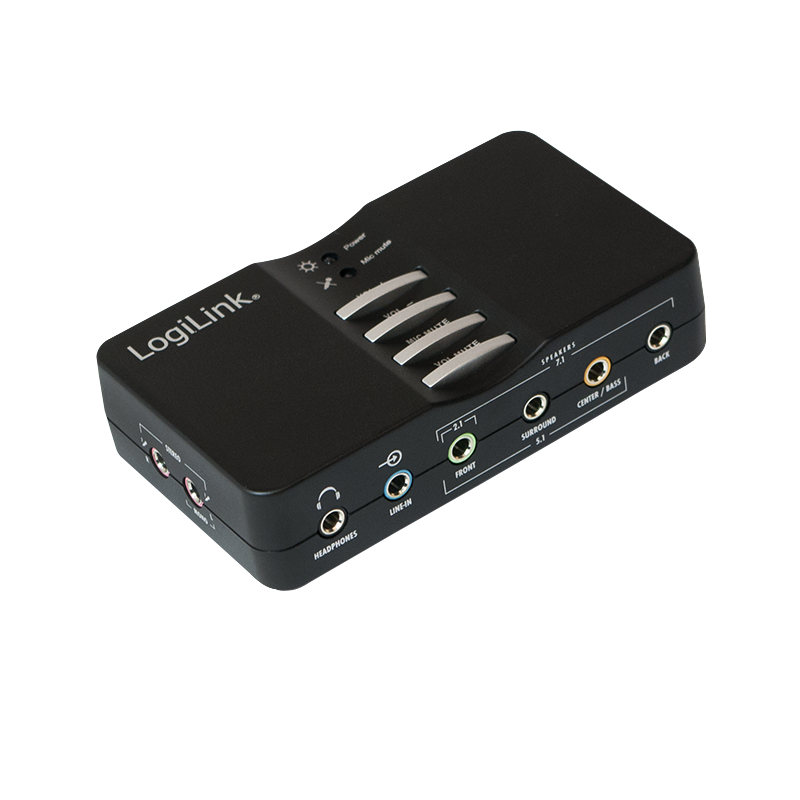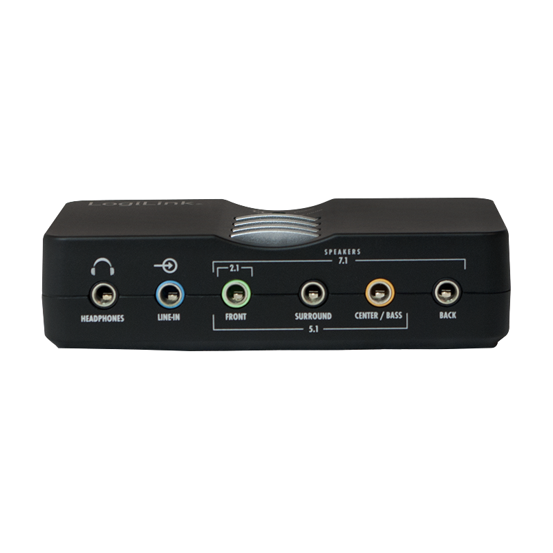 External sound processor. Computer Connection: USB 2.0 Port. Built-in 7.1 Channel Surround encoder. Supports 2, 4, 6 and 8 speakers. Modes: 2.0, 2.1, 5.1, 7.1. Simultaneous recording and playback. Inputs: Line-In, S / PDIF, microphone. Outputs: Headphone, S / PDIF. Front, Surround, Center, Bass, Rear. Function keys: Mute, Volume.