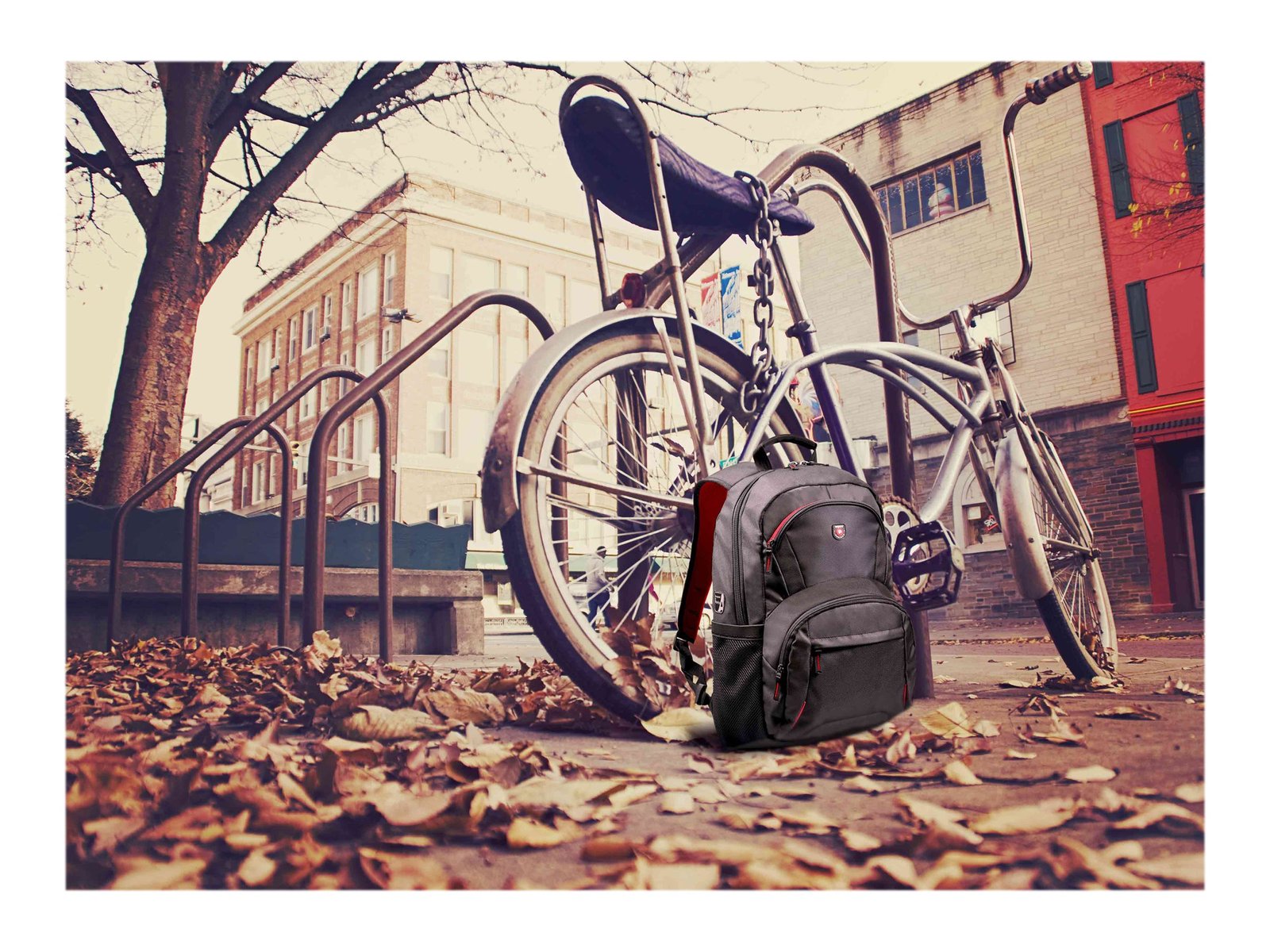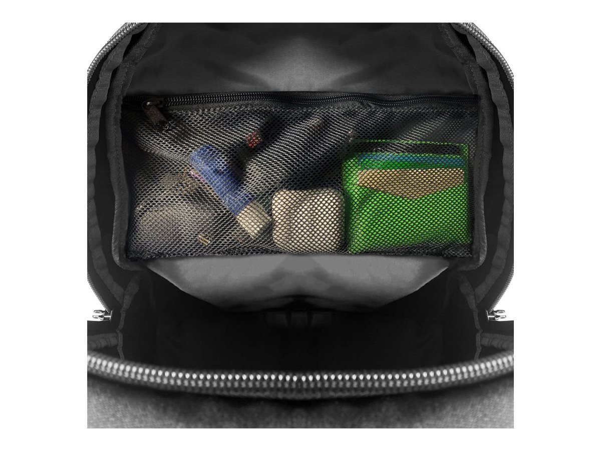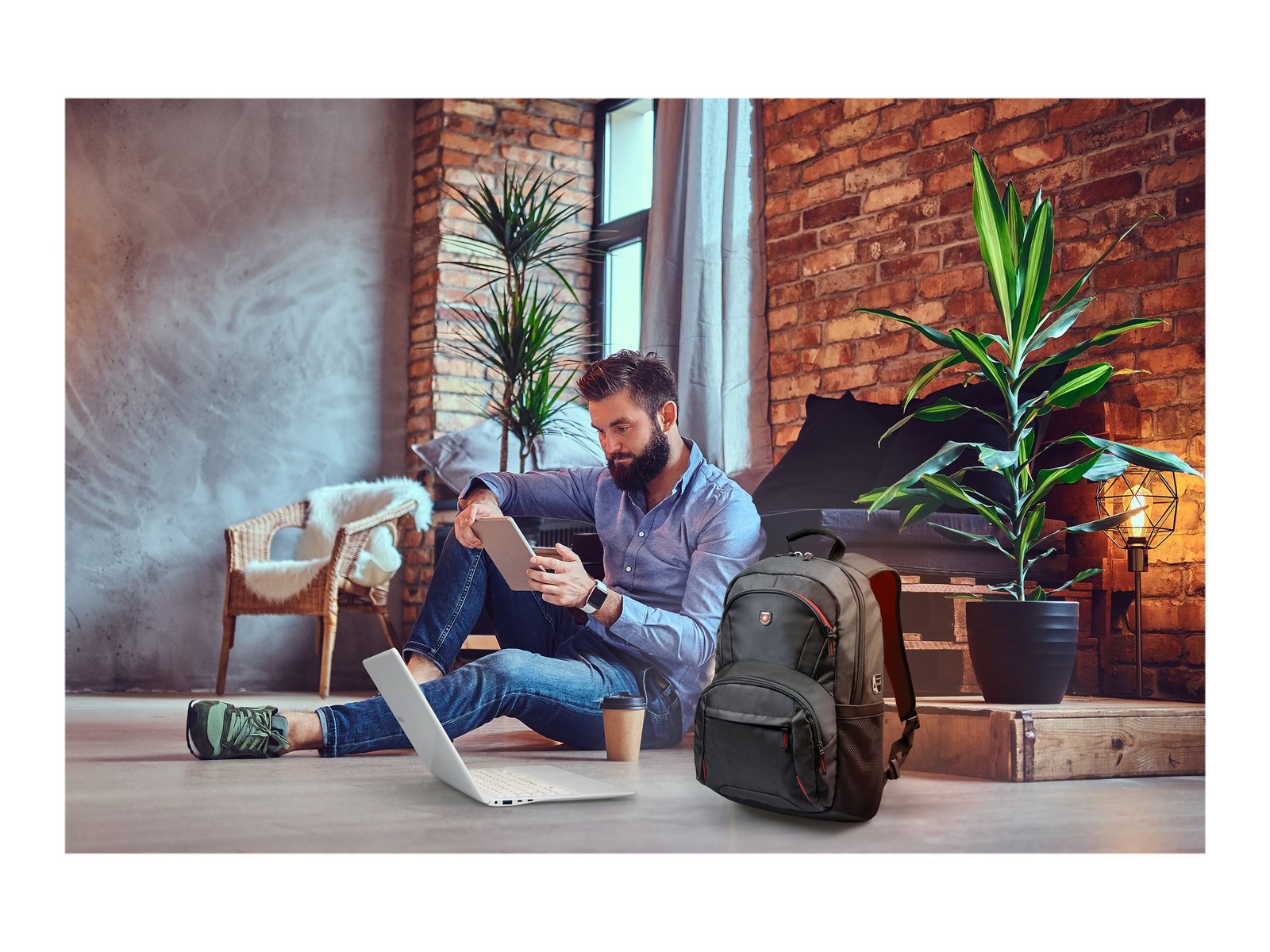 Padded laptop compartment with dedicated pocket for tablet up to 10,1’’ • Front pocket for accessories with organizer • 2 zipped pockets • 2 side mesh pockets • Padded bottom/shoulders and back • Rugged bottom part