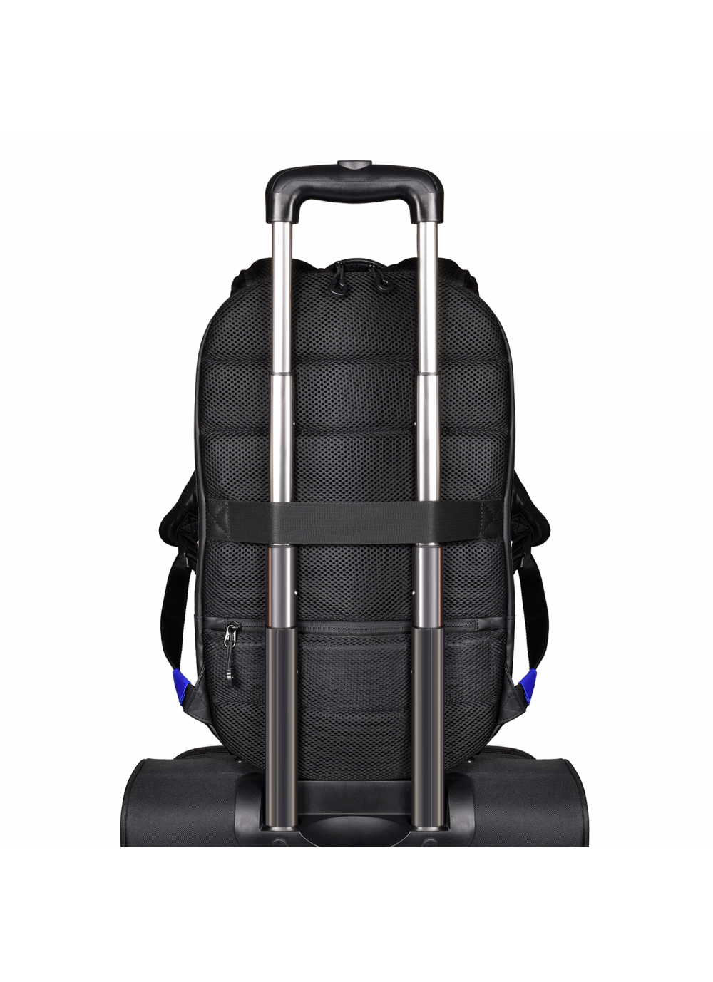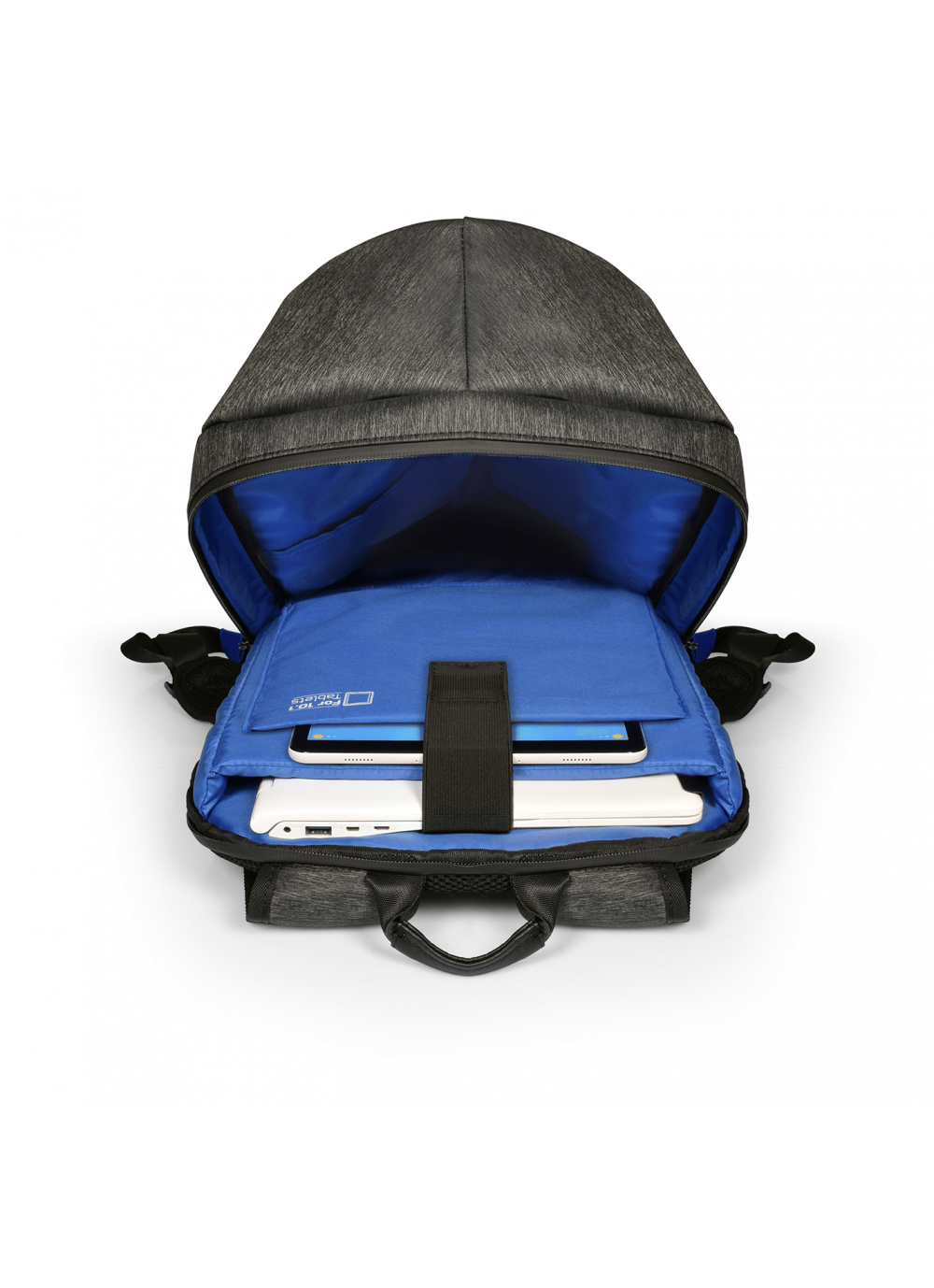 Integrated USB port to charge your devices anywhere; Dedicated padded laptop 15.6” & tablet up to 10” compartments; Made with water-repellent polyester; Waterproof zippers; Adjustable lap belt; Trolley strap for rolling luggage handle