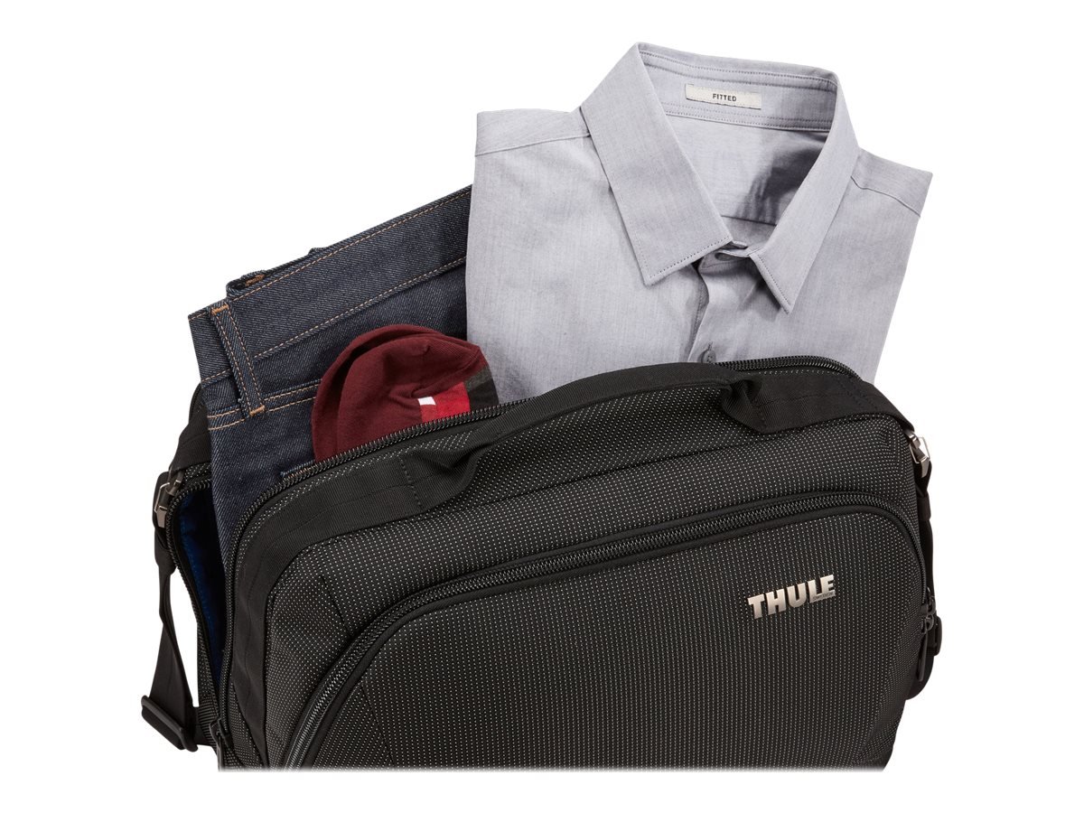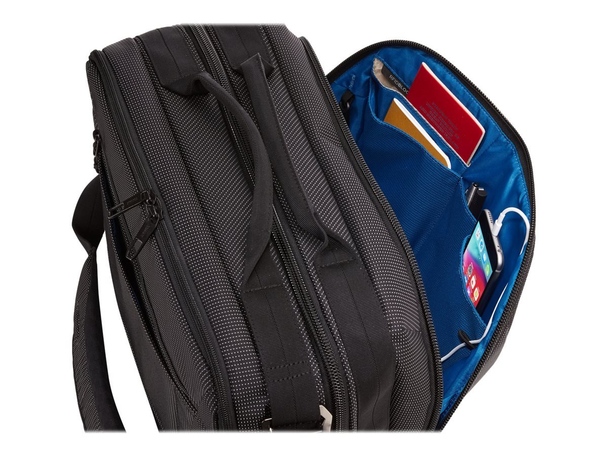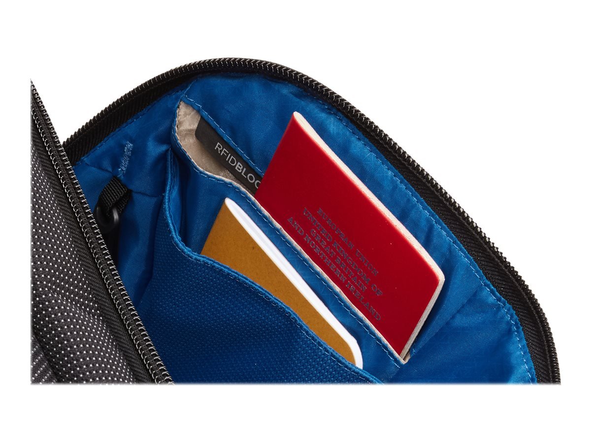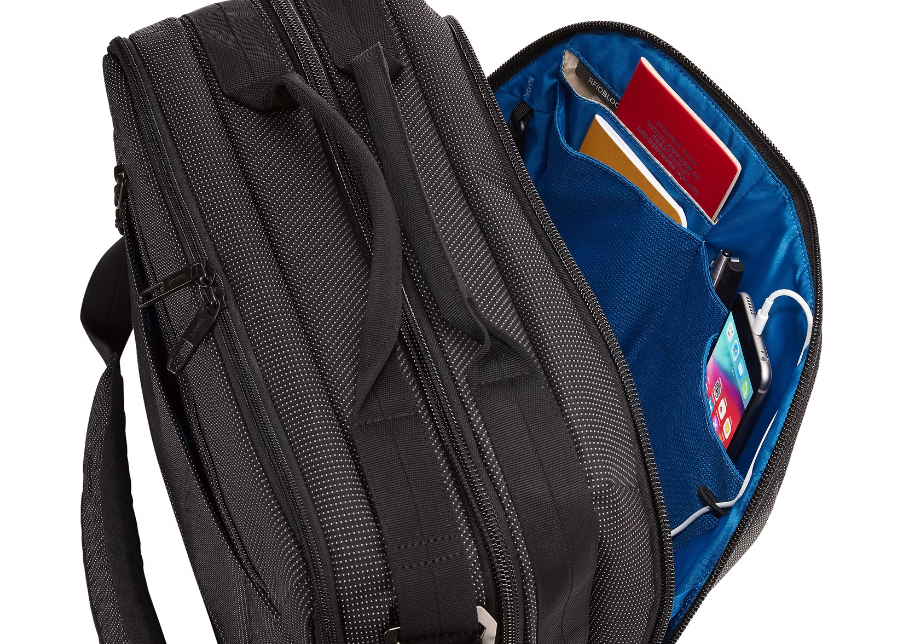 Organize small electronics and accessories in the front panel with slip pockets, elastic loops, a zippered mesh pocket and the PowerPocket cord management system for charging on the go